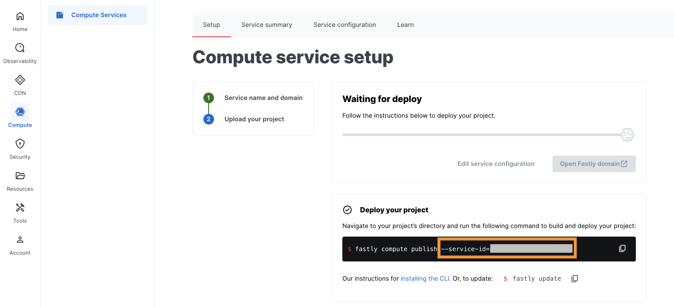 1. Go to Fastly UI → Compute → Compute services → Create service → Use a local project and create an instance for Wallarm.Once created, copy the generated