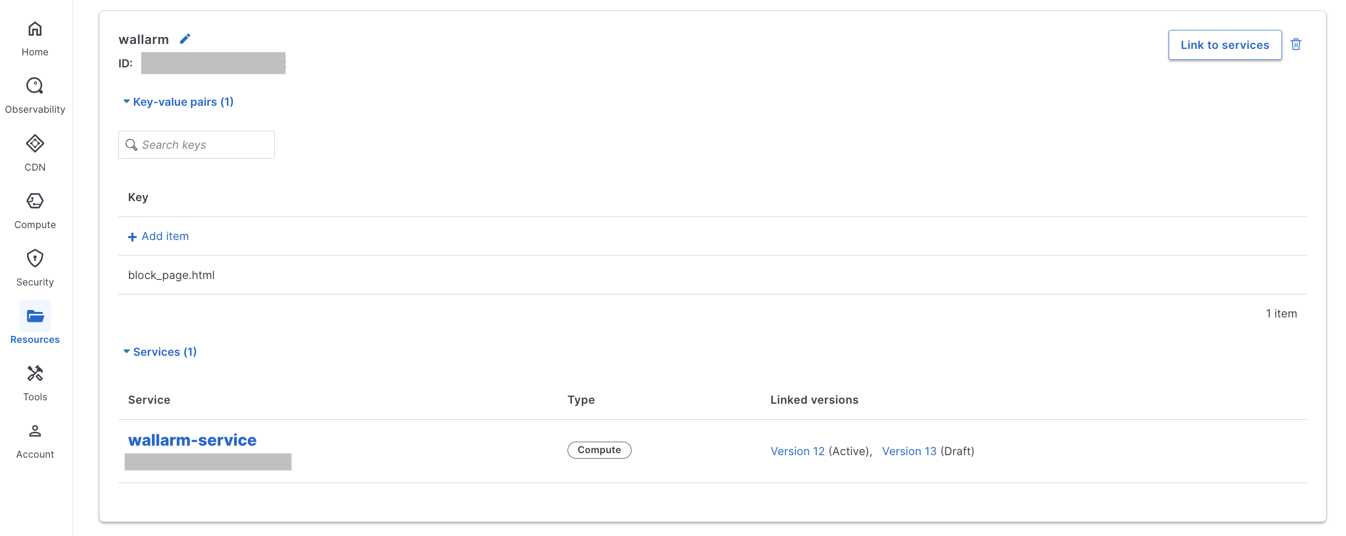block_page.htmland upload your custom HTML blocking page. This page will be returned to blocked requests. - Link the KV store to the Wallarm Compute service.