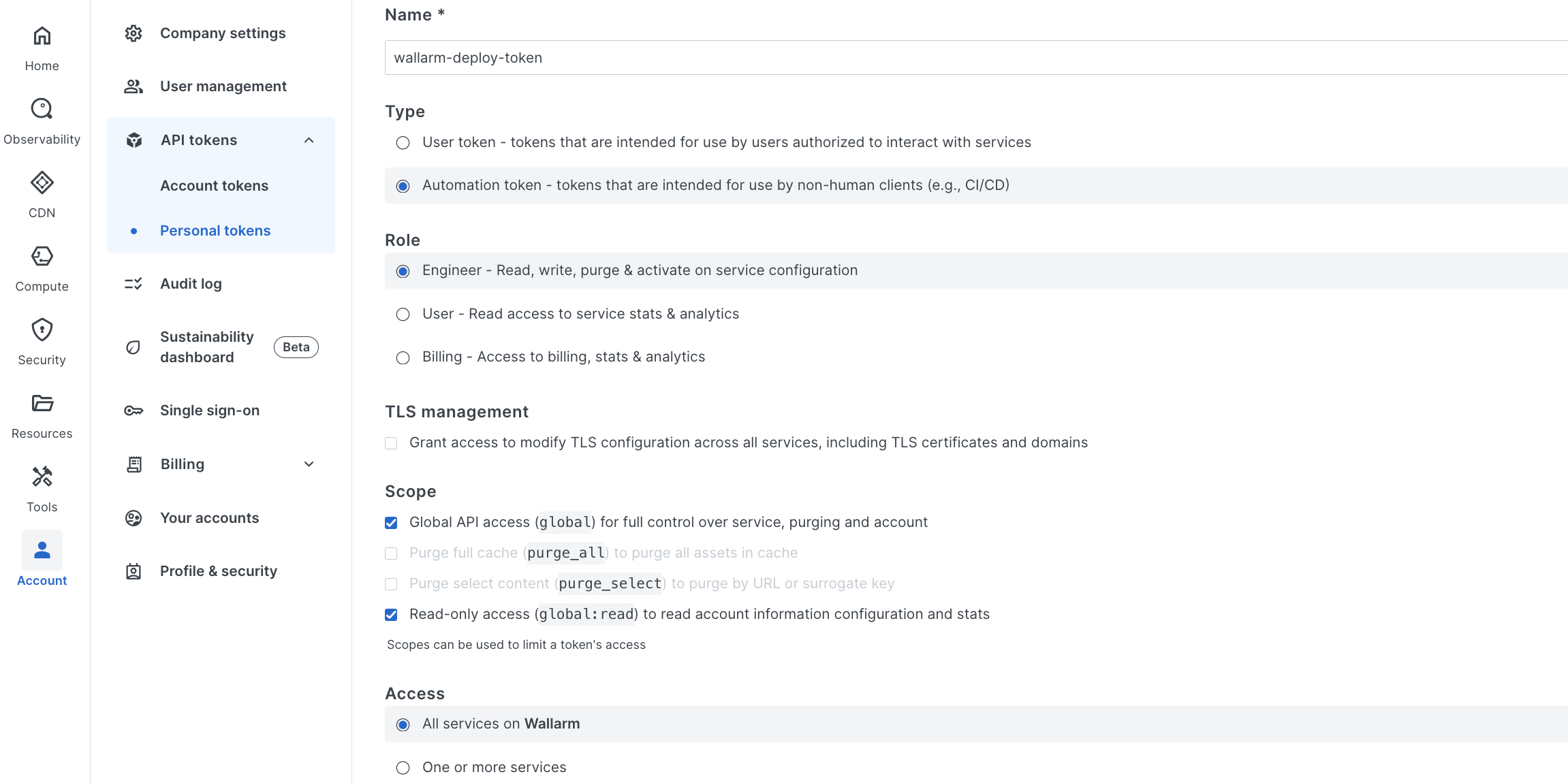 1. Go to Fastly UI → Account → API tokens → Personal tokens → Create token:- Type: Automation token