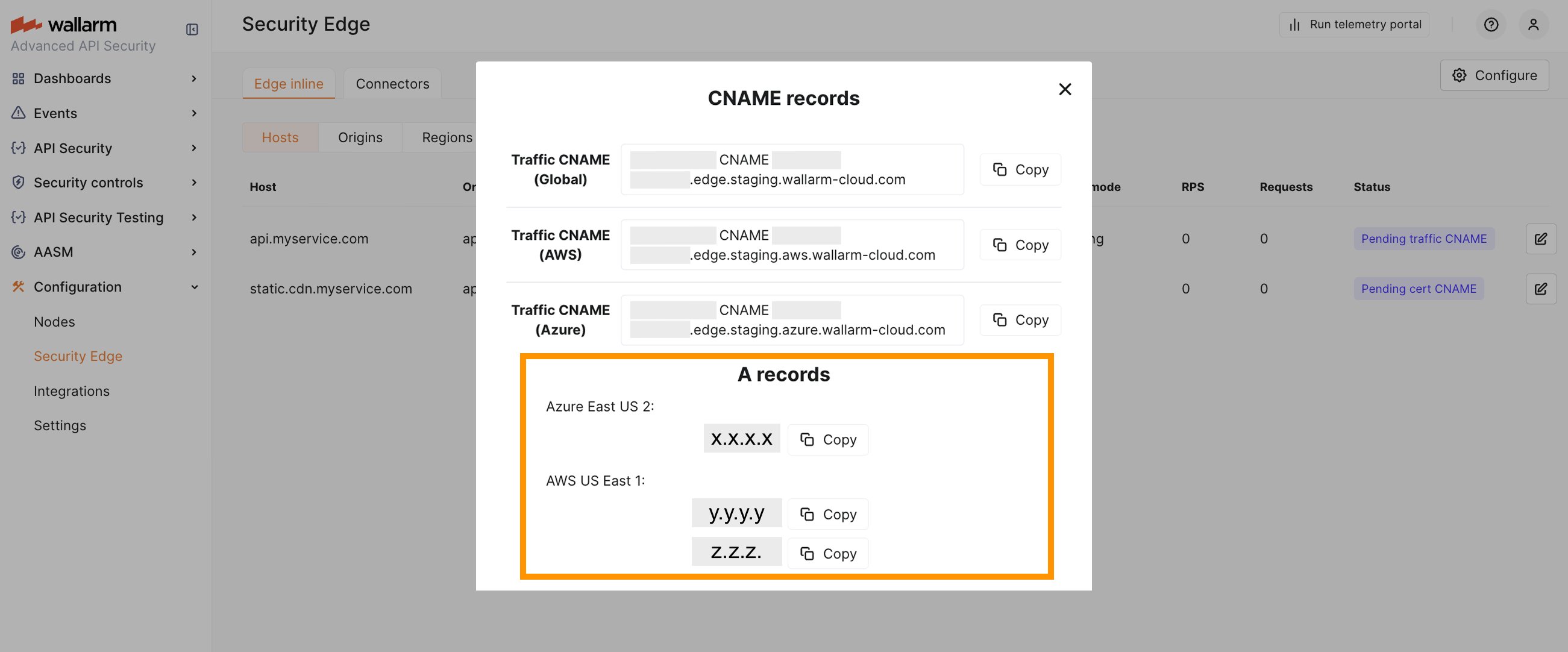 If your protected host is an apex domain (e.g., example.com), a CNAME cannot be used. In this case, the DNS setup must use A records, which are returned once the deployment becomes Active.