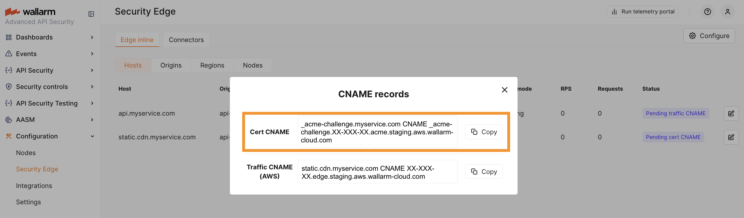 DNS changes can take up to 24 hours to propagate. Wallarm starts the Edge Node deployment once the CNAME records are verified (if needed).